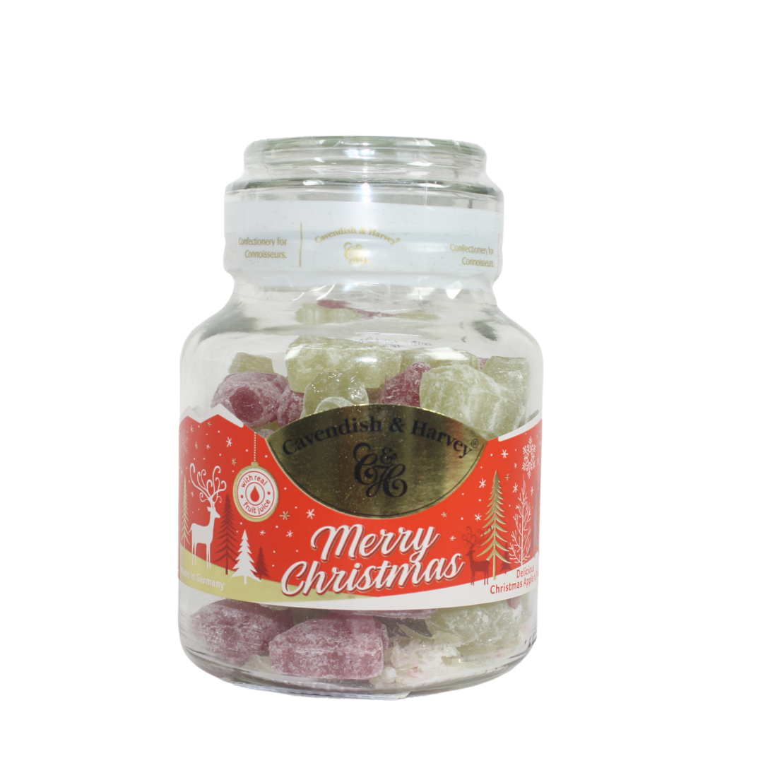 La magia de la Navidad se hace dulce con los caramelos Cavendish & Harvey – Merry Christmas Edition. Elaborados en Alemania con jugo de frutas, estos caramelos duros vienen en una presentación especial con frasco de vidrio decorado, perfecto para regalar, decorar o endulzar tu mesa navideña.